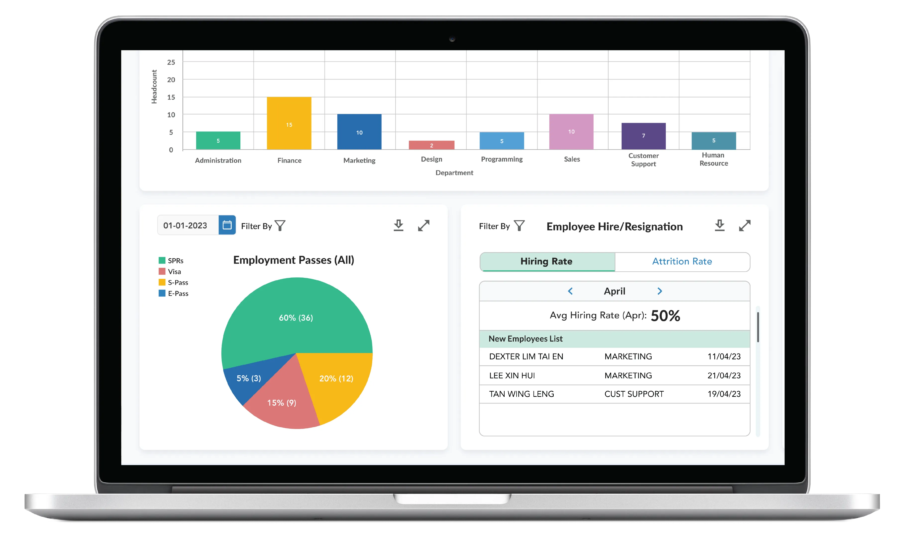 Generate tailored data insights easily, with exports to Excel and PDF, and grouping by department, designation, or category.